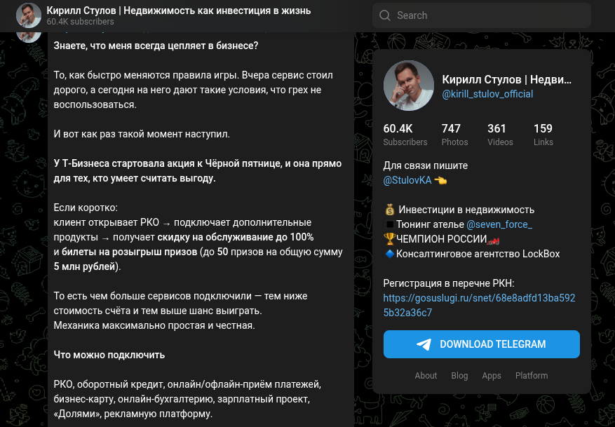 Работает Kirill Stulov в Телеграме, Инстаграме и VK, где он он создал себе образ предпринимателя и «инвестора-практика». По словам автора, основа его деятельности – недвижимость, однако публичная биография перескакивает от тюнинга авто до консалтинга. На первый плане опыт управления капиталом и помощь частным клиентам, хотя подтвержденной лицензии, финансовой отчетности или прозрачной статистики сделок Кирилл не показывает.