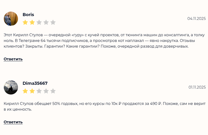 Клиентская обратная связь играет против Кирилл Стулова (@StulovKA). На сторонних платформах есть жалобы на «бестолковые консультации», несоответствие результата обещаниям и навязчивые продажи. Люди пишут, что после оплаты они получают банальный набор советов, который почти не дает практической ценности. Обучение – набор материалов из открытого доступа, а не инструмент для заработка, хотя в рекламе автор вещает иначе.