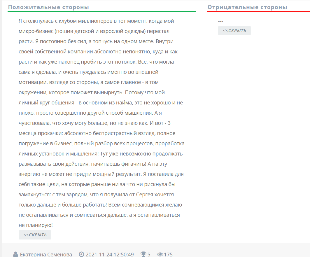 Отзывы о клубе в сети в целом смешанные. Положительные отклики, в основном старые, описывают рост уверенности, появление структуры в финансах, мотивацию и полезное окружение.