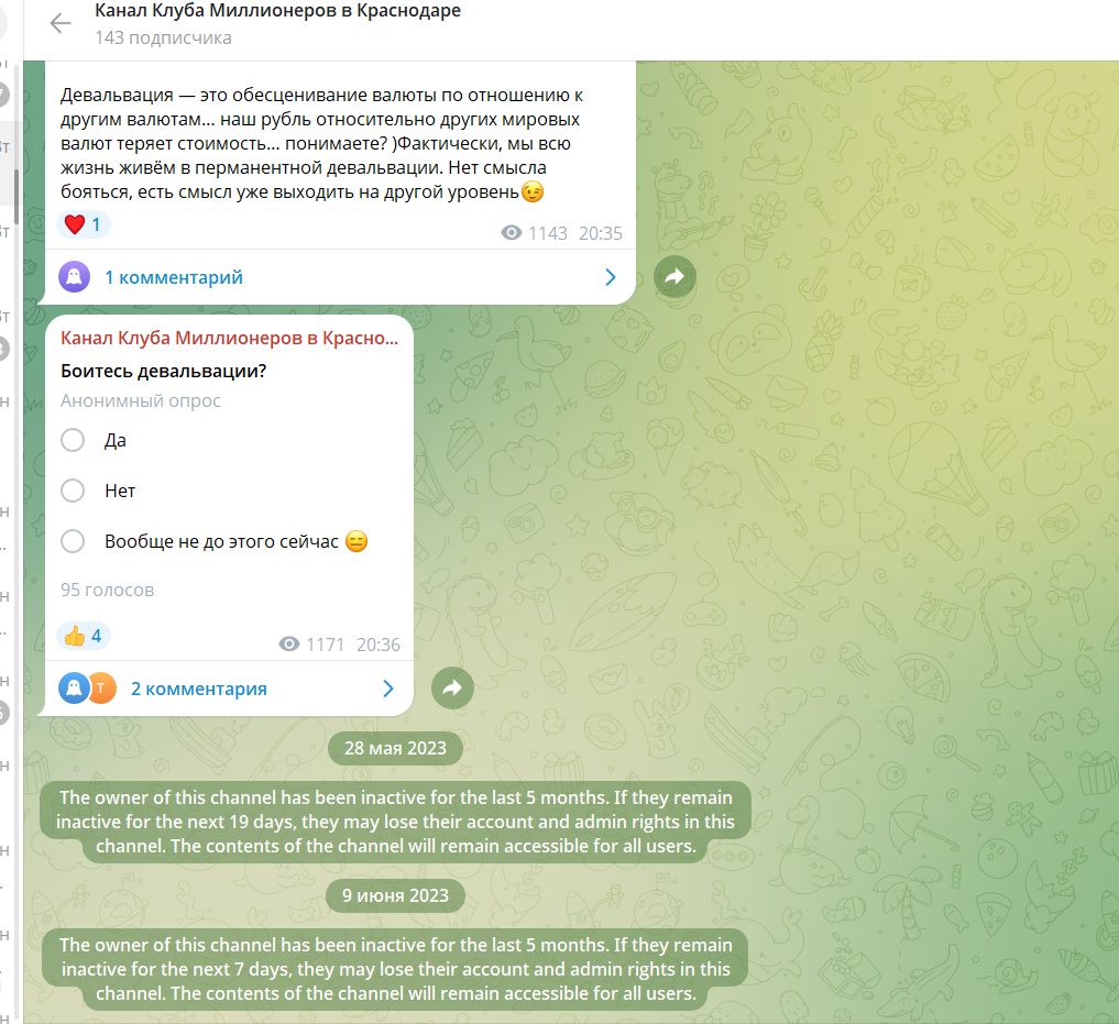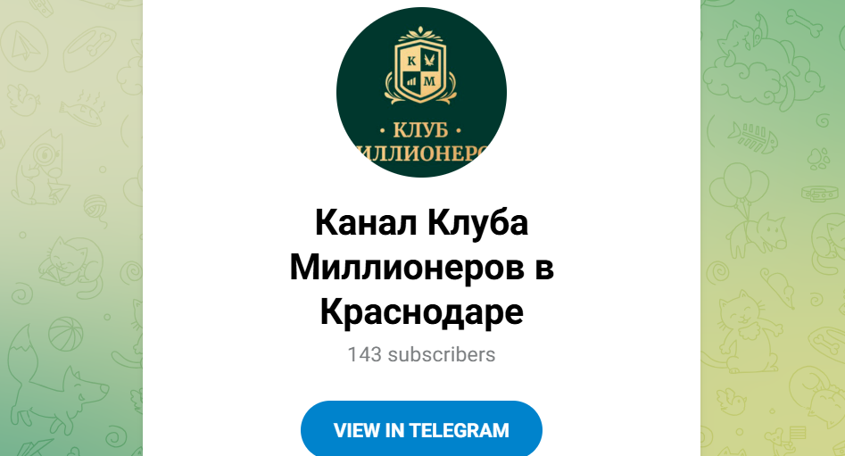 Телеграмм канал “Клуба Миллионеров в Краснодаре” насчитывает 143 подписчика, при этом последняя активность датируется 2023 г., паблик не обновляется.