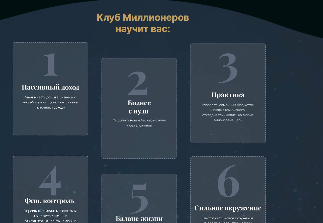 Вся подача проекта это формулировки про мышление миллионера, окружение, финансовую грамотность и личный рост, без конкретных цифр, методик, измеримых результатов или прозрачной статистики.