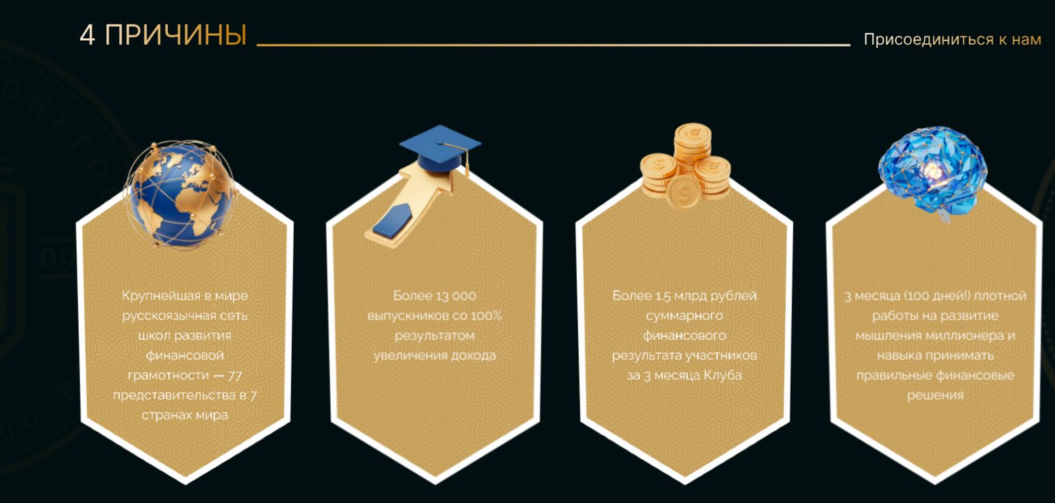 Проект подается как долгосрочное образовательное сообщество для людей, которые хотят разобраться с деньгами, бизнесом, инвестициями и окружением. На официальном сайте акцент делается не на быстрый заработок, а на изменение мышления, выстраивание финансовых привычек и системный подход к доходам.