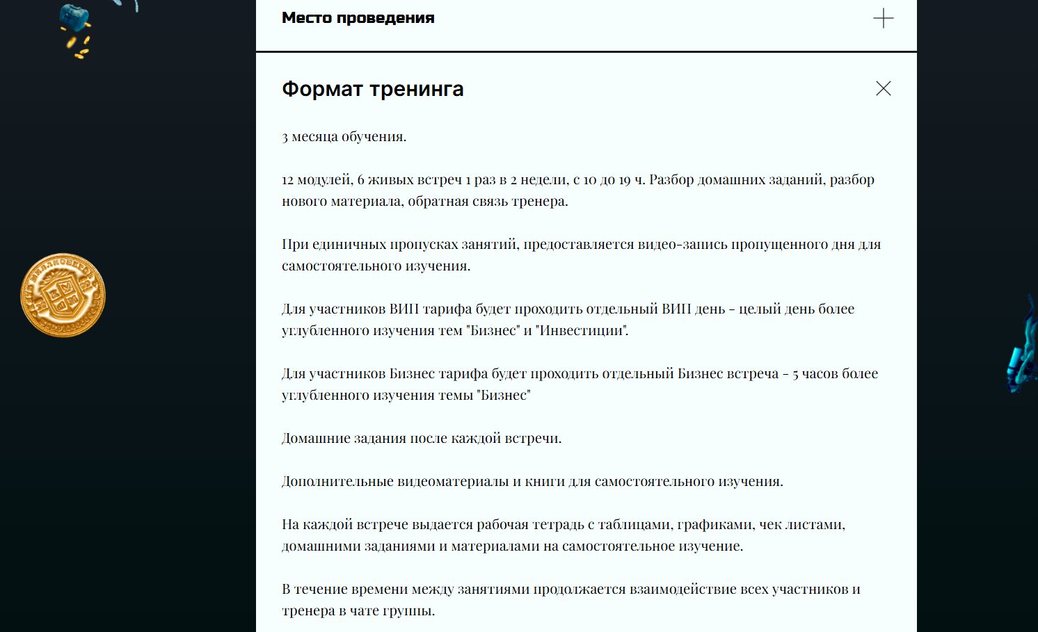 Это не профессиональное финансовое образование и не лицензированные инвестиционные курсы, а именно формат тренинга и наставничества, рассчитанный на широкую аудиторию без специальной подготовки.