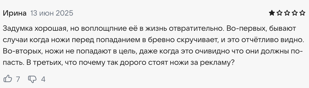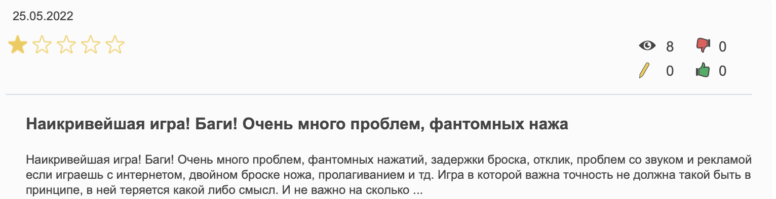 Куда больше тех, кто откровенно разочарован игрой. На Knife Hit отзывы часто упоминают зависание геймплея в самый неподходящий момент и постоянная реклама. Хотите играть без нее — платите. Желаете воспользоваться «необычным» ножом — это тоже платно. В итоге создается впечатление, что без дополнительных вливаний игра откровенно буксует и загоняет юзера в угол, выбраться из которого можно только за деньги.