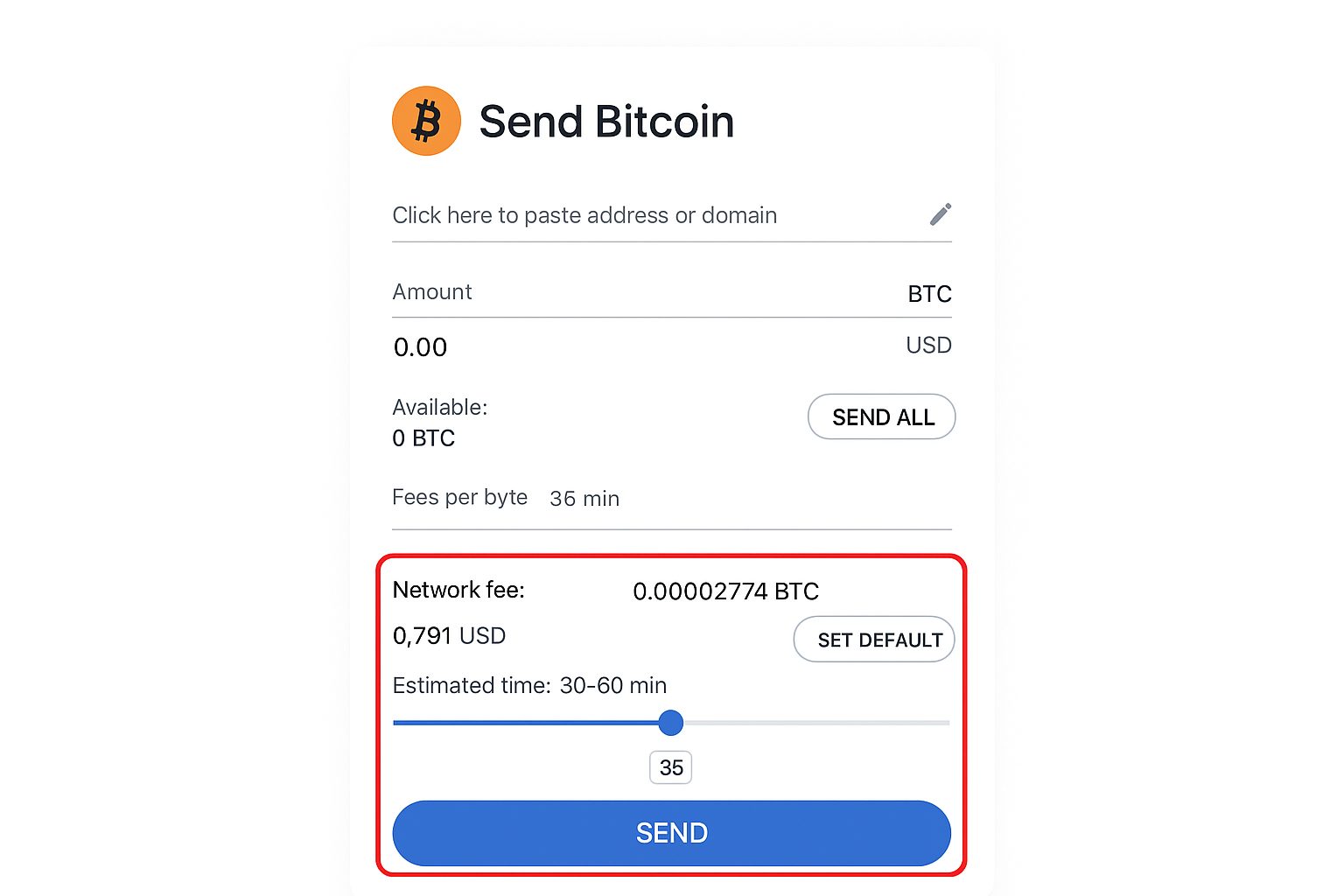 Если клиент поддерживает ручную установку комиссии (пример — Atomic Wallet), при вводе адреса и суммы будет доступен ползунок или поле для значения.