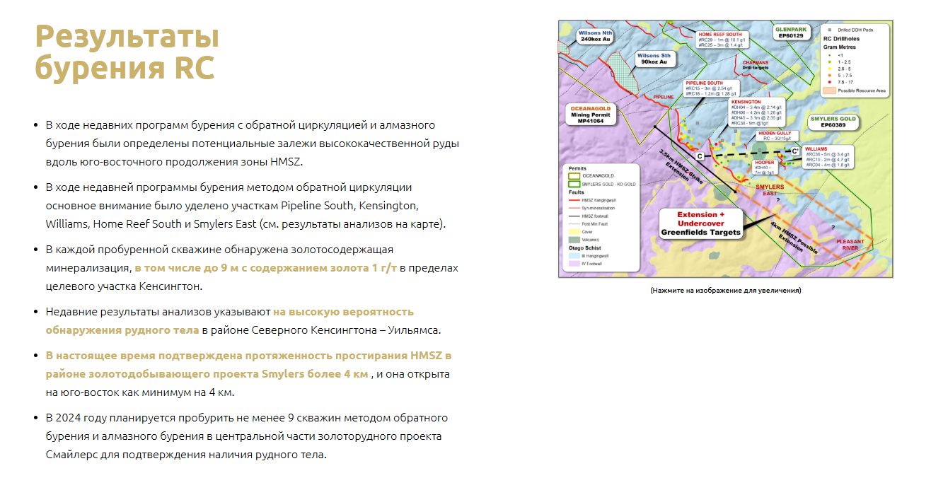 Контент посвящен техническим аспектам добычи. Описаны лицензии, территории, результаты бурения. Упоминается поддержка местных общин маори и властей Новой Зеландии. Подчеркивается стабильность юрисдикции и развитая горнодобывающая инфраструктура региона.