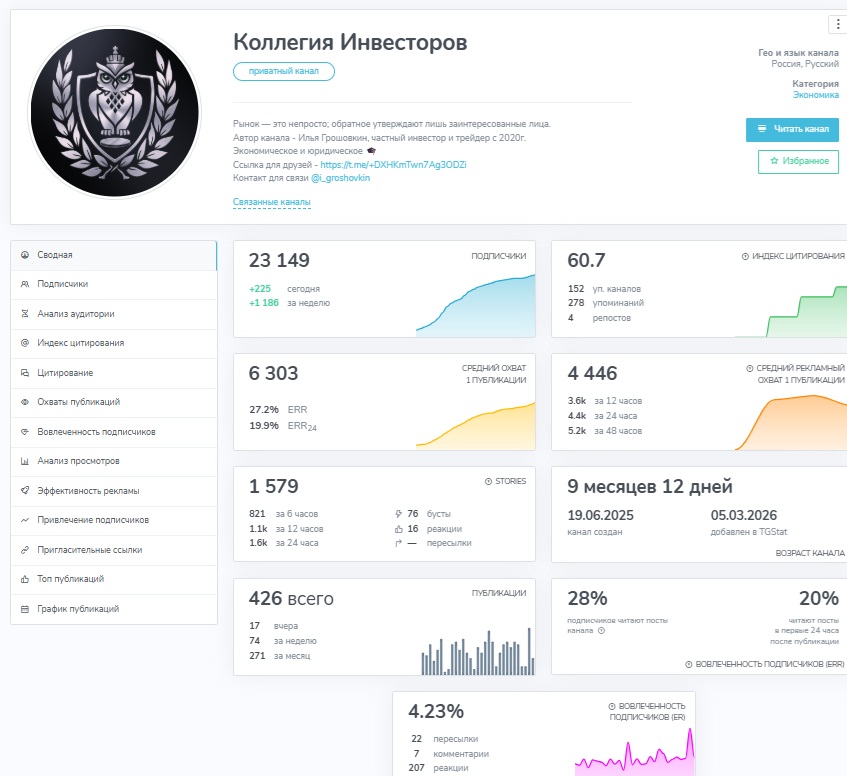 Основной и по сути единственный ресурс проекта — Телеграм-канал «Коллегия инвесторов». На момент анализа количество подписчиков составляет около 23 200 человек. Согласно данным TGstat, канал был создан 19 июня 2025 года, то есть существует чуть больше девяти месяцев. В TGstat канал добавили 5 марта 2026 года