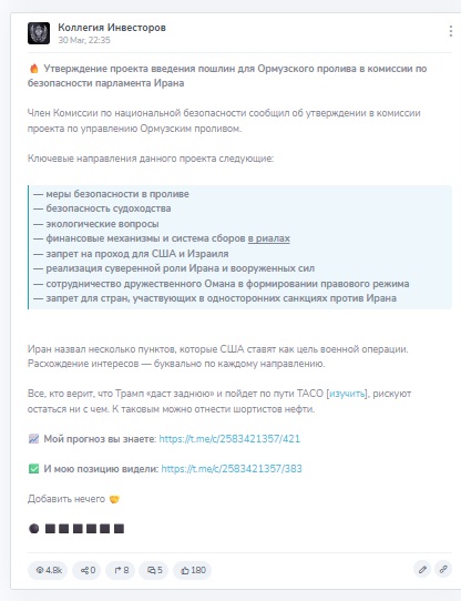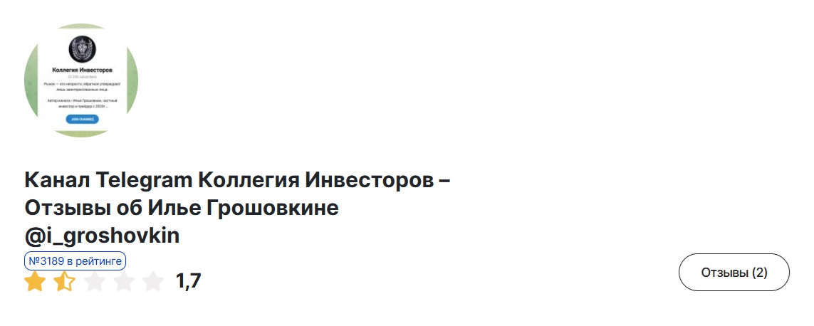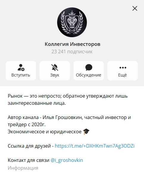 Телеграм-канал «Коллегия инвесторов» называет себя сообществом для трейдинга на фондовом рынке и криптовалютах. Лицо проекта — трейдер Илья Грошовкин. Доверять этому каналу пока оснований нет: стабильной прибыльной торговли не видно, а реальные отзывы только начинают появляться — активная реклама стартовала недавно.