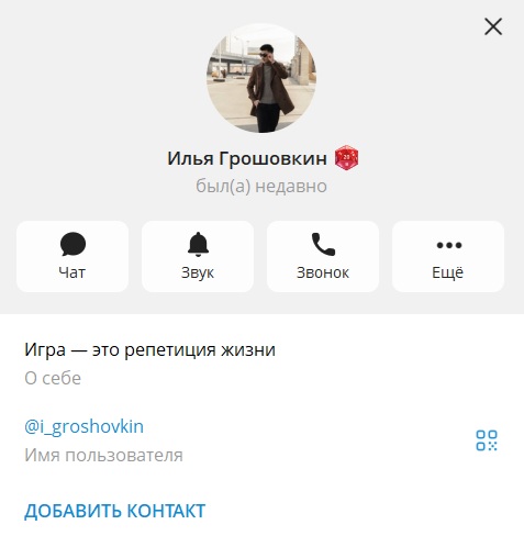 Личный аккаунт Ильи Грошовкина в Telegram оформлен минимально. В профиле указана только статусная фраза «Игра — это репетиция жизни» и имя пользователя. Активность в личном аккаунте как отдельном медийном ресурсе отсутствует, автор практически не использует его для публикаций.
