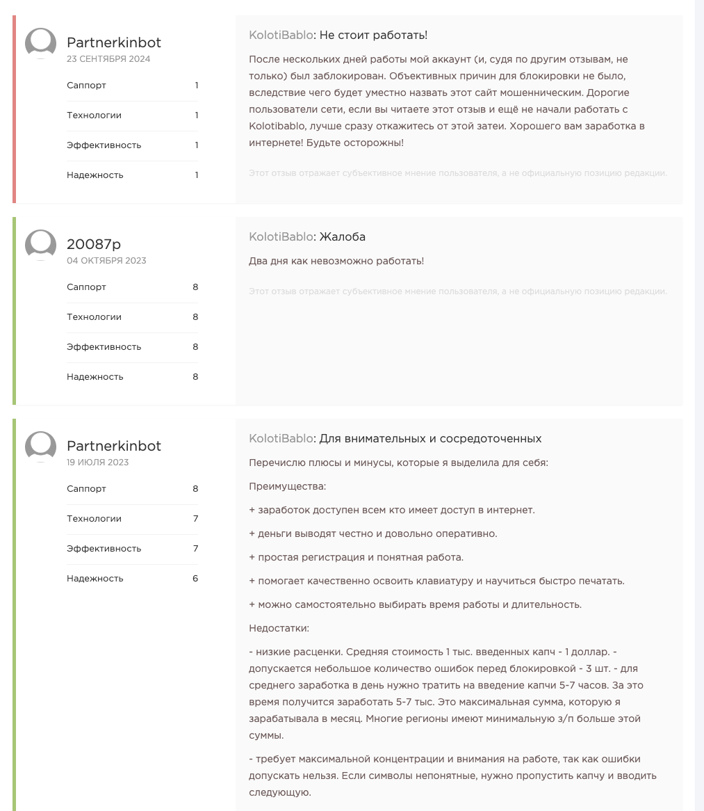 Отзывы о kolotibablo com смешанные. Авторы позитивных ревью заявляли, что этот сервис является отличным решением для получения дополнительного заработка.