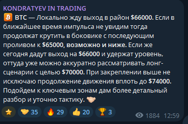Контент канала Kondratyev In Trading делится на три типа: обзоры по BTC с уровнями и базовыми сценариями движения цены, бесплатные сигналы по альткоинам с точками входа и стопами, а также регулярные приглашения в платное «партнерство» через личные сообщения.