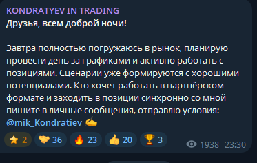 Автор канала «Кондратьев ин Трейдинг» предлагает партнерскую торговлю, поэтому посты с призывом написать в личные сообщения за условиями выходят практически каждый день.