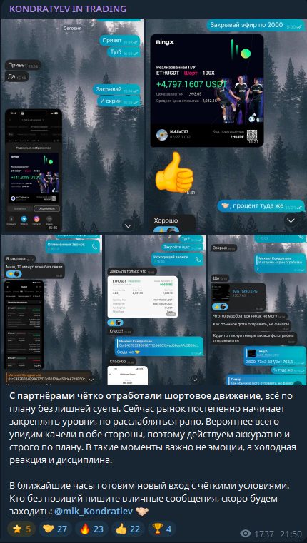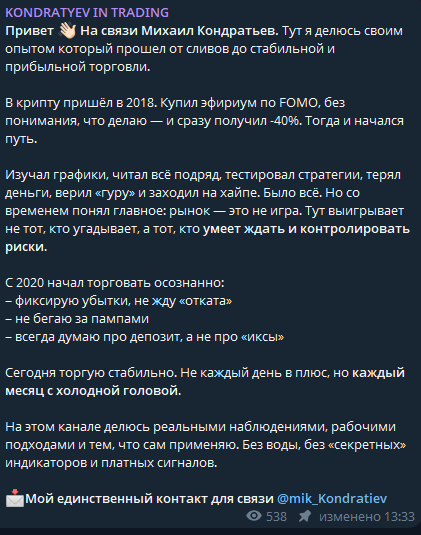 Kondratyev In Trading – телеграмм-канал о криптовалютной торговле и инвестициях. Автор канала Михаил Кондратьев публикует обзоры рынка и приглашает подписчиков в платную «партнерскую торговлю» через личные сообщения. В статье разберем канал, сигналы, проверим отзывы и статистику торговли.