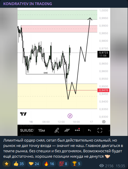 Бесплатные сигналы выходят редко и часто отменяются до исполнения. Например, сигнал по SUI был снят, потому что рынок не дал точку входа. Такие отмены не считаются убыточными в статистике канала, хотя подписчик, который зашел по рынку и начал торговать по этим данным, мог уже потерять деньги по этой системе.