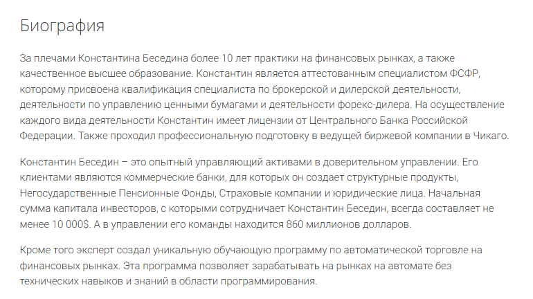 Константин Беседин предлагает аудитории авторскую обучающую программу по автоматической торговли. Главное преимущество курса якобы возможность получать стабильный доход без необходимости разбираться в программировании или круглосуточно следить за графиками – все работает автономно.