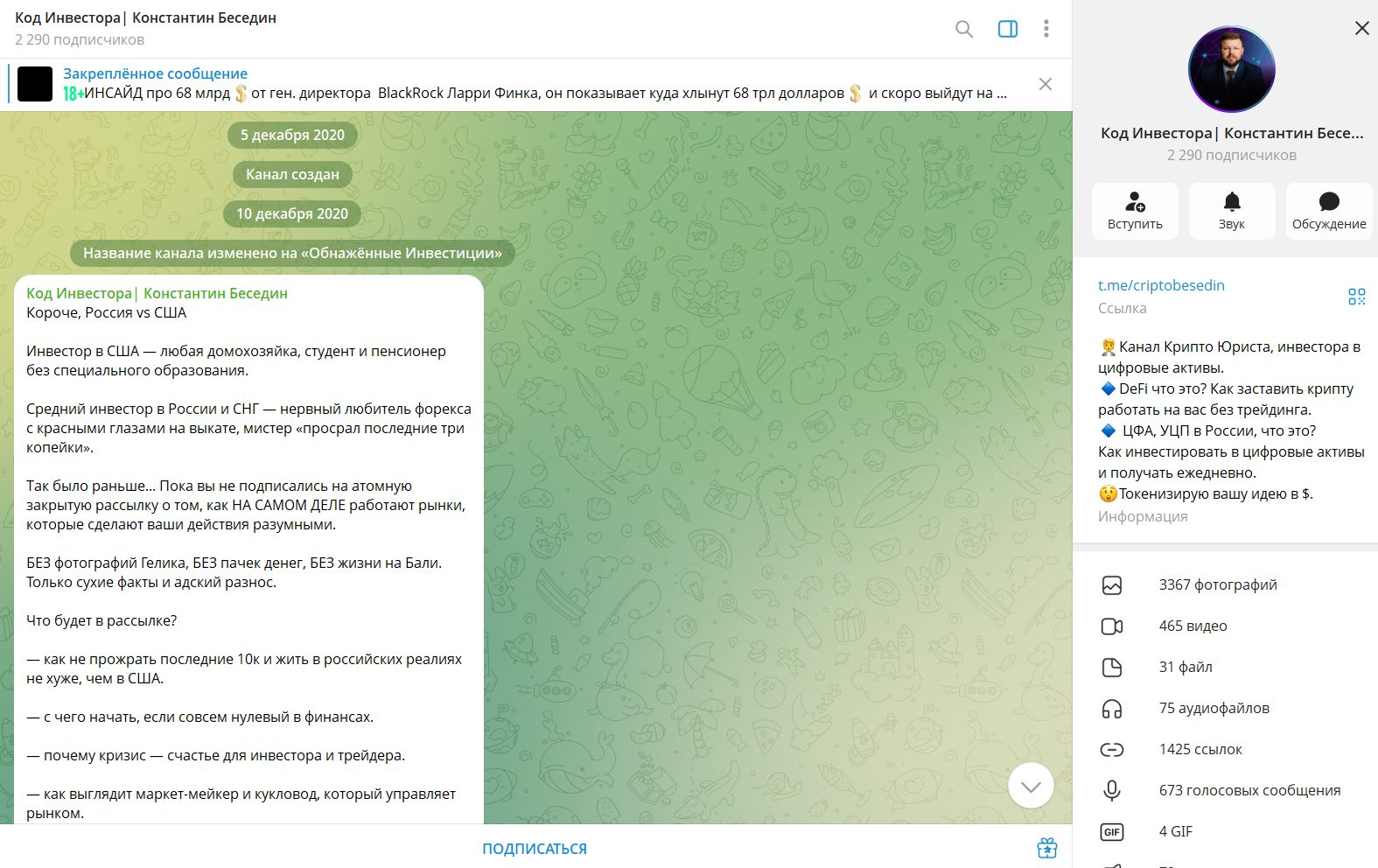 Константин Беседин делится с аудиторией новостями крипторынка и проводит анализ трендов. Админ обсуждает плюсы и минусы разных инструментов для заработка в периоды кризисов и санкций. На канале встречается реклама ботов с сигналами, обучающих программ и мастер-классов.