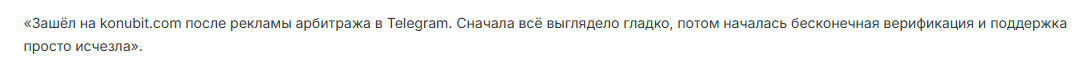 На Konubit в марте 2026 года оставляют только отрицательные отзывы. Пользователи сообщают, что узнали о площадке из популярных социальных сетей и мессенджеров – на связь с потенциальными клиентами представители биржи выходят самостоятельно. Менеджеры в личных сообщениях обещают легкий заработок на арбитраже криптовалют – регистрация якобы простая, депозит проходит без проблем и пр. На деле же пользователи сталкиваются с бесконечной верификацией и игнором саппорта.