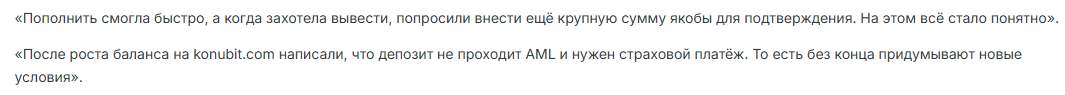 Авторы отзывов о Konubit рассказывают, что при попытке вывести прибыль система требует внести дополнительный платеж, и новые условия продолжают появляться по ходу работы – то страховка, то AML и пр.