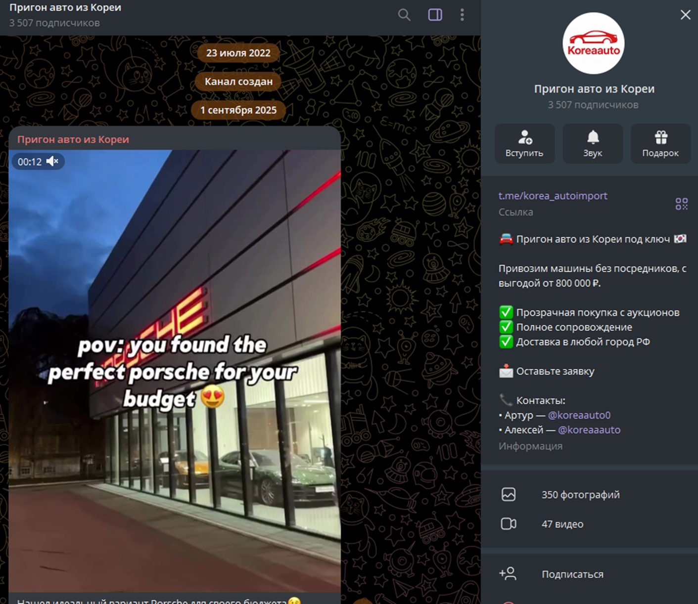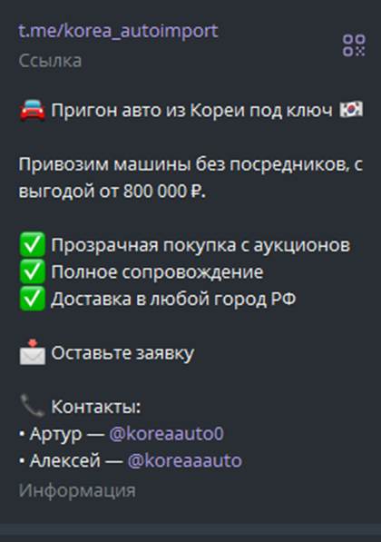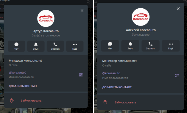 Связь предлагается только через Телеграмм канал «Пригон авто из Кореи» (Korea AutoImport). Тут публикуется каталог машин и даются два контактных лица. Но о менеджерах, кроме имен, нет никакой подробной информации. Они представляются, как Артур KoreaAuto и Алексей KoreaAuto. Профили незаполненные, скорее всего, были созданы недавно только для работы с проектом. По всем вопросам приобретения авто и оплаты рекомендуется писать в личку на их персональные аккаунты KoreaAuto0 и KoreaaAuto.