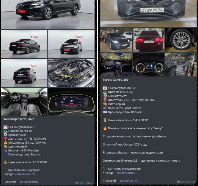 Телеграмм магазин KoreaAuto Net предлагает выкуп недорогих машин на аукционах Сеула и их быструю доставку в Россию. Потенциальным заказчикам рассказывают о прекрасном техническом состоянии, полном сопровождении под ключ и отсутствии наценок. Но ничего не говорят о гарантиях и условиях заключения договора. Все это делает покупку автомобиля рискованной, тем более что на автосалон Korea Auto Import отзывы отсутствуют, Телеграмм канал с каталогом фактически начал работать немногим более 3 месяцев назад.