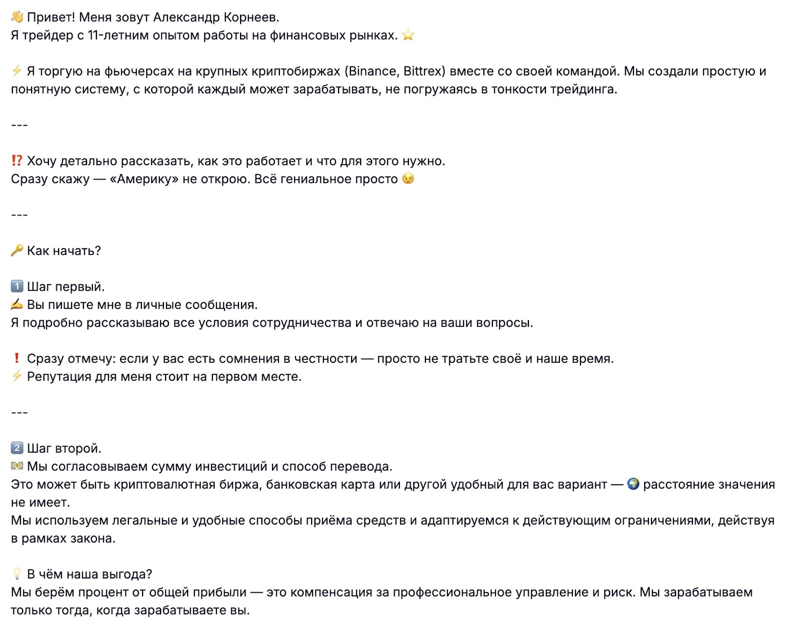 Александр Корнеев позиционирует себя как частный криптотрейдер, управляющий капиталом. Основной продукт — не обучение и не открытые сигналы, а именно индивидуальная работа с депозитами через формат доверительного управления. Пользователь не получает стратегию или системные знания, а передает средства под управление с расчетом на процент от прибыли.