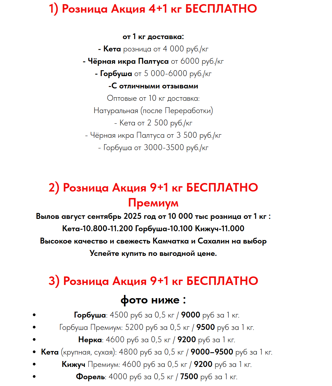 3. 9+1 бесплатно. Клиентам предлагают горбушу по цене 9000 р/кг, нерку — 9200 р/кг, Форель — 7500 р /кг и т. д.