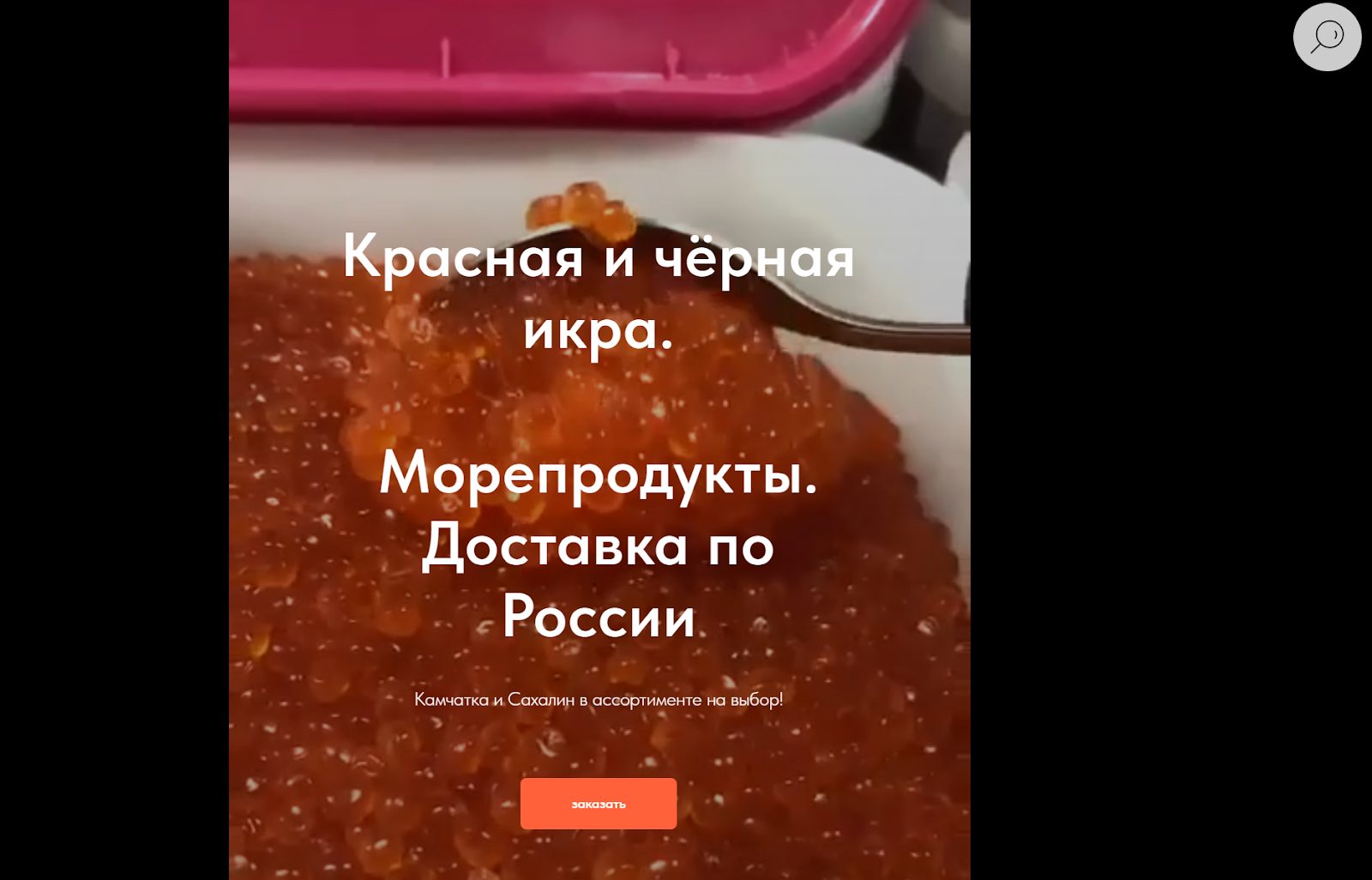 Для продвижения услуг герой обзора создал официальный сайт красная-икра-доставка-по-россии рф. Ресурс имеет крайне простое оформление и представлен в виде одностраничника. Сразу после входа потенциальным клиентам показывают большую емкость с товаром и демонстрируют его качество.
