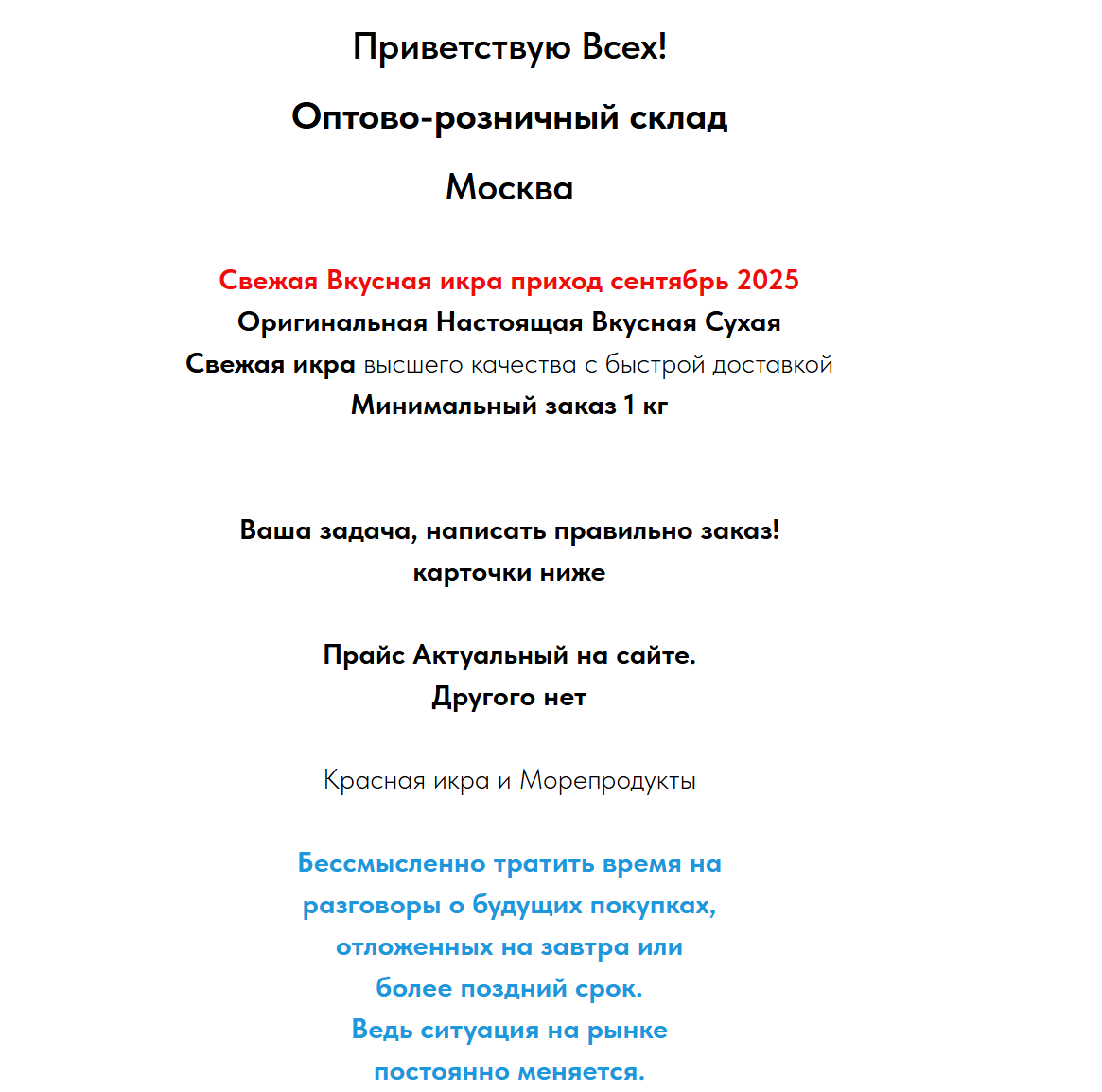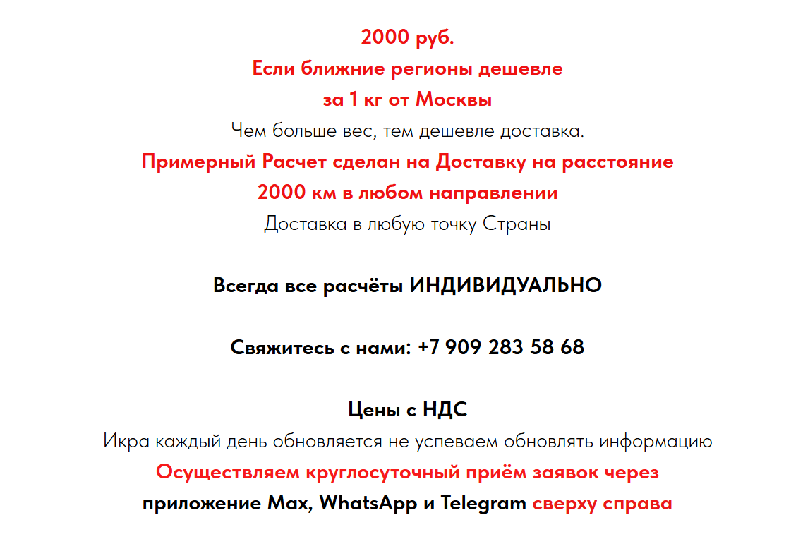 Главной “фишкой” остается низкая цена черной и красной икры. По факту прайс подается крайне сумбурно. В некоторых случаях стоимость товара по России даже ниже, чем предлагает Krasnayikra. Ряд предложений и вовсе не актуальны на декабрь 2025 года. Это означает, что прайс-лист плохо проработан.