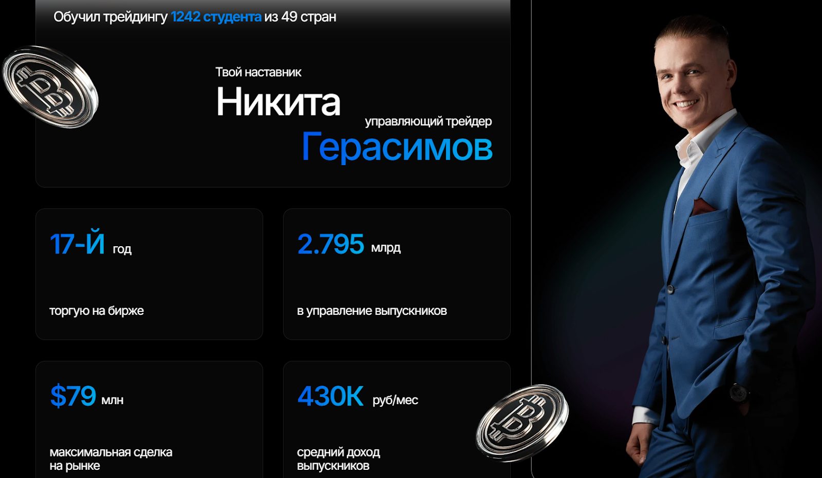 Никита Герасимов утверждает, что его личная самая крупная маржинальная сделка принесла 79 миллионов долларов, а средний доход его студентов составляет 430 рублей в месяц.