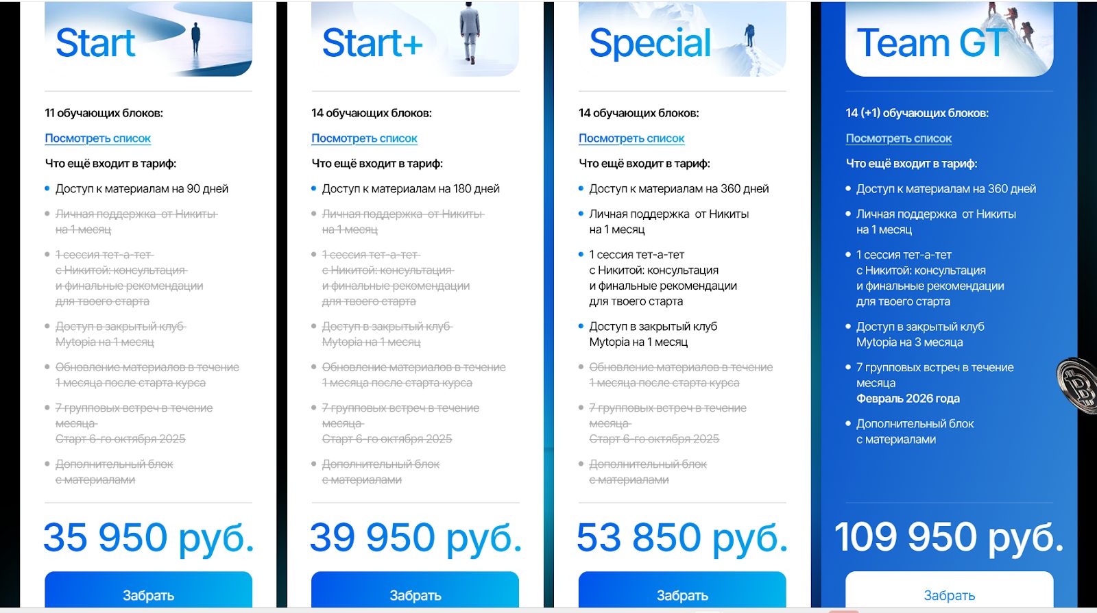 Есть 4 тарифных плана: Start, Start+, Special и Team Gt. Они отличаются количеством обучающих блоков, сроком доступа к материалам и сопровождением. В 2 самых дорогих пакета входит личная поддержка от Никиты и доступ в закрытый клуб.