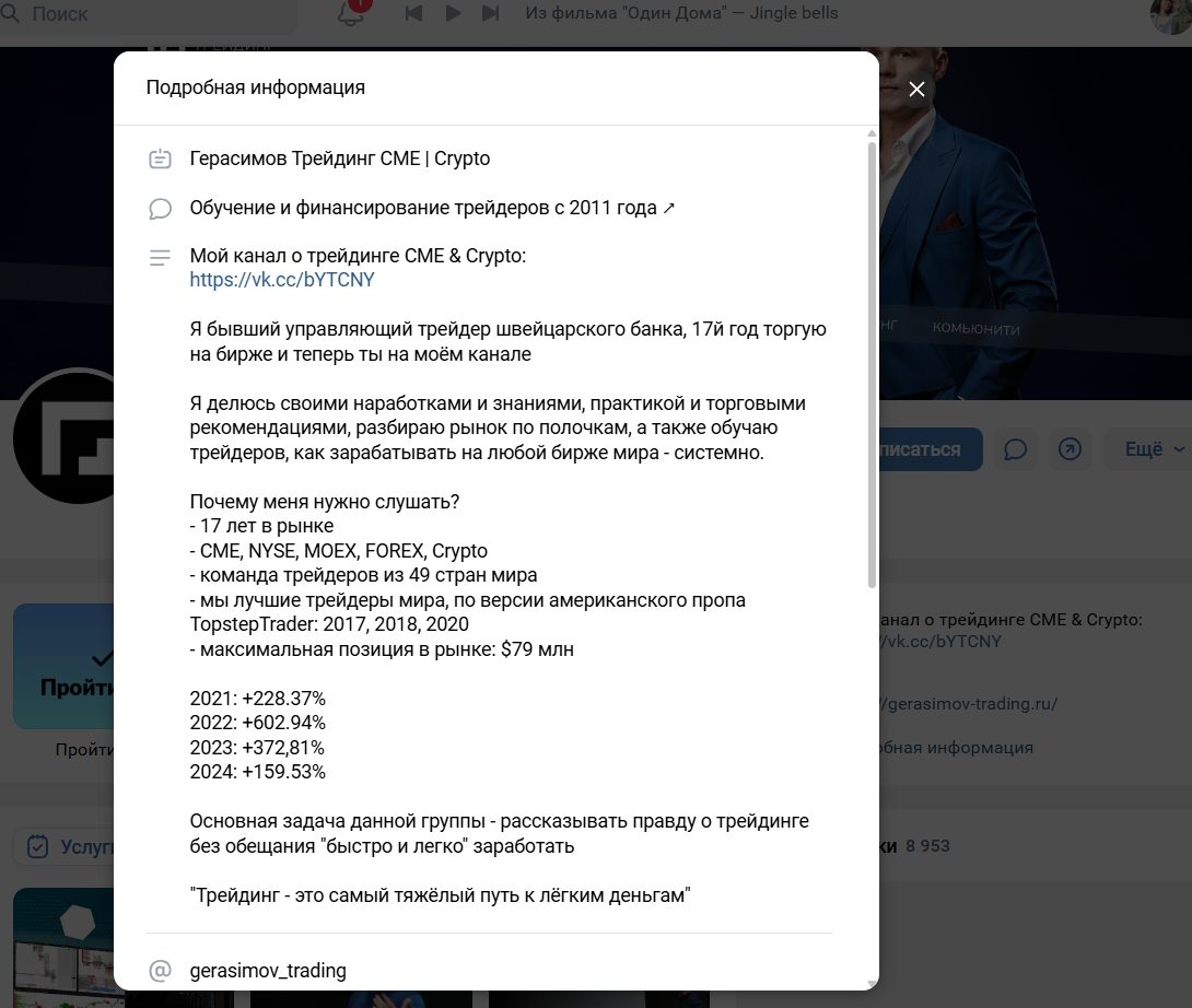 Специалист также ведет соцсети. Есть канал на Ютуб, где он выступает как опытный трейдер с обзорами, практическими занятиями и советами новичка. Был ТГ-канал, сейчас он не открывается через поисковик. В группе автор выкладывал аналитику рынка. Сейчас можно всю информацию получать через ВК. Блогер утверждает, что был управляющим швейцарского банка, но это, как и другая информация о нем, не подтверждается.