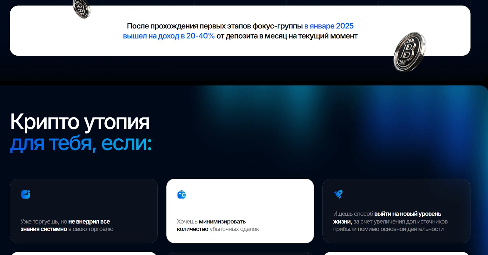 Образовательной программе «КриптоУтопия» посвящен сайт-одностраничник Baza gerasimov trading ru. Там есть информация о том, чего можно добиться благодаря обучению, упомянуты проблемы и желания целевой аудитории – новичков и трейдеров среднего звена, которые уже начали работать, но не добились весомых результатов. Но если вчитаться в рекламный текст, можно обнаружить, что в нем мало деталей, фактов и цифр, в основном упор делается на эмоции.