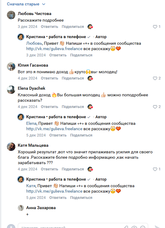 Под постом сообщества “Работа в телефоне” размещены отзывы о Кристине в положительном ключе. Пользователи восторгаются трудолюбием автора и интересуются подробностями заработка. Всем комментаторам отвечает администратор группы, оставляет ссылки для перехода в сообщения сообщества. Никаких публичных подробностей.
