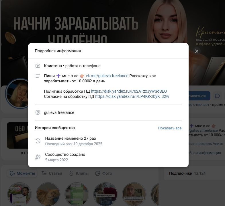 На странице сообщества основное предложение сформулировано просто: написать в личные сообщения и узнать, как зарабатывать от 10 000 рублей в день. Когда публичный экран проекта короткий, а содержательная часть уходит в приватный диалог, у пользователя меньше возможности заранее сравнить условия, формат работы, порог входа и юридические рамки.