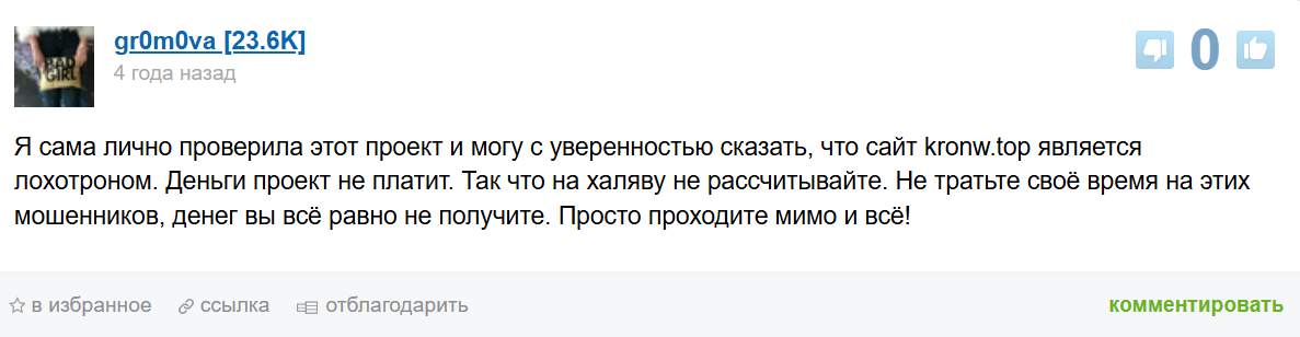 Рассматриваемый проект работал недолго, поэтому и отзывов о Kronw Top немного. В тех же комментариях, что удалось найти, клиенты подтверждают невозможность вывести деньги. Некоторые жертвы сразу отмечают, что за рассматриваемым проектом скрывается мошенническая схема. Они уверенно говорят, что сайт не платит.