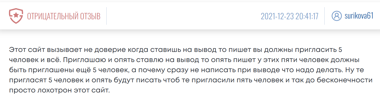 Главные сложности появлялись при попытке вывести средства. Одним из условий представители компании ставят приглашение пяти человек. После выполнения условия появляется еще одно. Оказывается, что каждый из новых участников должен привлечь еще по пять людей. Такое происходит до бесконечности.