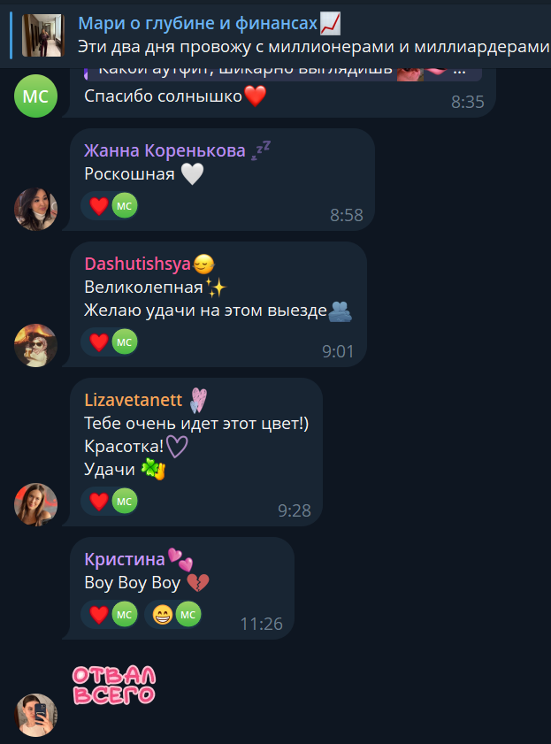 На канале в Телеграмм «Мари о глубине и финансах» автор описывает разочарования в бизнесе, так как с ним нельзя было выйти на прибыль в миллиарды рублей, поэтому девушка и решила торговать криптовалютой. Владелец проекта утверждает, что имеет инвестиционный портфель в $1,000,000, но никаких доказательств этому нет.