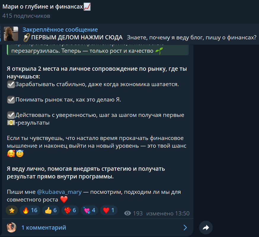 На профиль в Инстаграм с ником Kubaeva_Maria подписалось более 2000 пользователей, но на канале в Телеграмм всего 400 участников. Статистики на аналитических сервисах нет, но ручная проверка показала, что посты просматривают все подписчики, а также иногда пишут комментарии и ставят по 30-40 реакций на публикации.