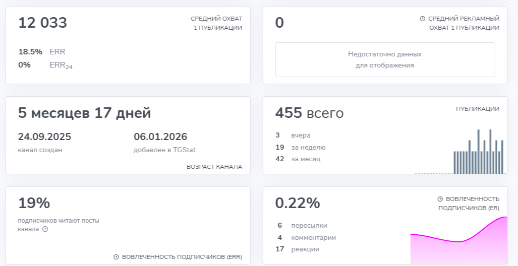 Телеграм-канал «Кванта АИ про нейросети» появился в мессенджере 24 сентября 2025 года. На момент обзора проект имеет практически 65 000 подписчиков. Вовлеченность целевой аудитории составляет всего 0,22%. Такой результат намекает на использование накрутки ботами.