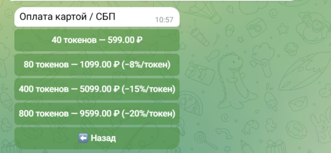 Оплата услуг бота Quanta AiBot осуществляется с помощью карт или СПБ. Посредством перечисленных платежных сервисов приобретаются токены. Онлайн можно купить от 40 до 800 токенов. Цена минимального пакета составляет 599 рублей.