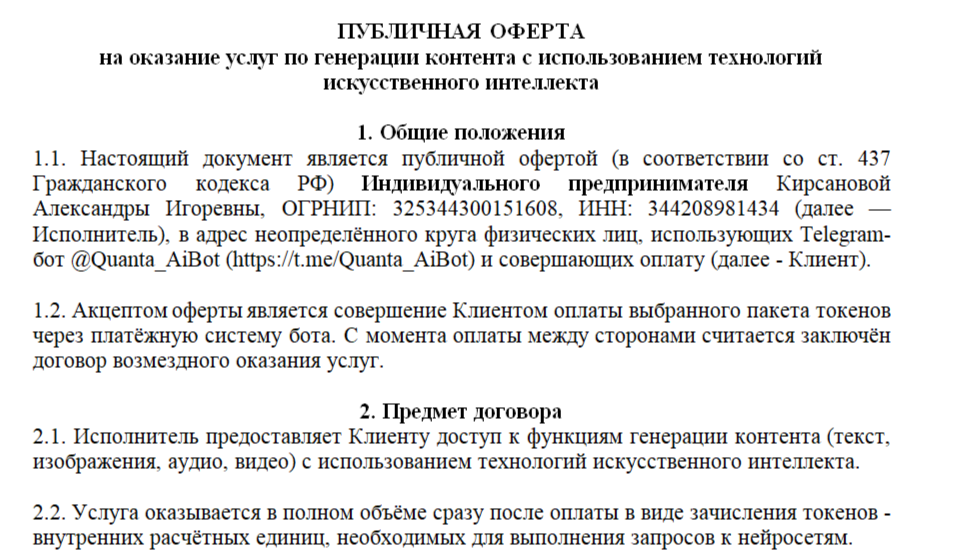 Универсальный помощник с искусственным интеллектом работает на основании публичной оферты Кирсановой Александры Игоревны (ОГРНИП: 325344300151608, ИНН: 344208981434). Ознакомиться с документом можно посредством телеграм-канала или с помощью обращения к саппорту ресурса.