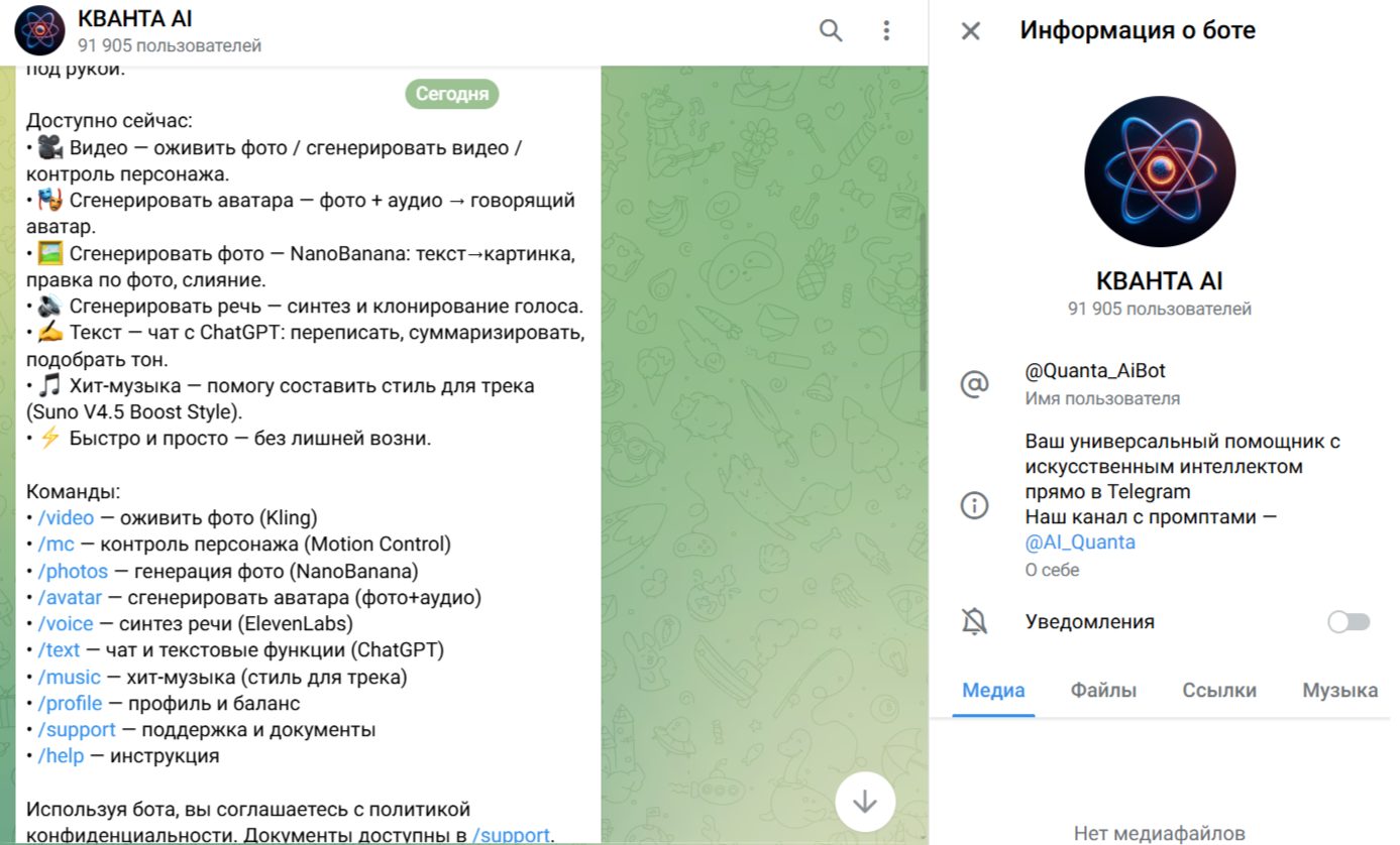 Подписчикам телеграм-канала «Кванта AI про нейросети» доступен бот «Кванта AI» (Quanta AiBot). Он работает прямо в мессенджере. С помощью бота пользователи могут выполнять следующие задачи: