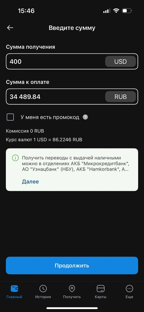 Затем введите сумму, которую планируете отправить. Сервис автоматически конвертирует ее в российские рубли. Внизу экрана будет указан курс обмена.