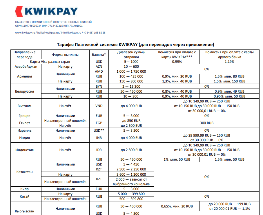 Комиссионные сборы в Kwikpay зависят от направления, суммы и способа отправки. Официально заявленная комиссия — от 0% до 5% (например, для перевода до 20 000 рублей — фикс 199 рублей, свыше — 1,1% от суммы). Для популярных коридоров (Турция, Армения, Узбекистан) тарифы минимальны. Подробная таблица размещена на официальном сайте платежной системы. Кроме того, перед транзакцией пользователь видит подробный расчет и сумму сбора.