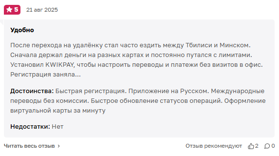 В целом, если нужен качественный, быстрый и экономичный способ международных переводов без нарушения закона, Kwikpay — достойный выбор, система быстро набирает популярность на российском и мировом рынке.