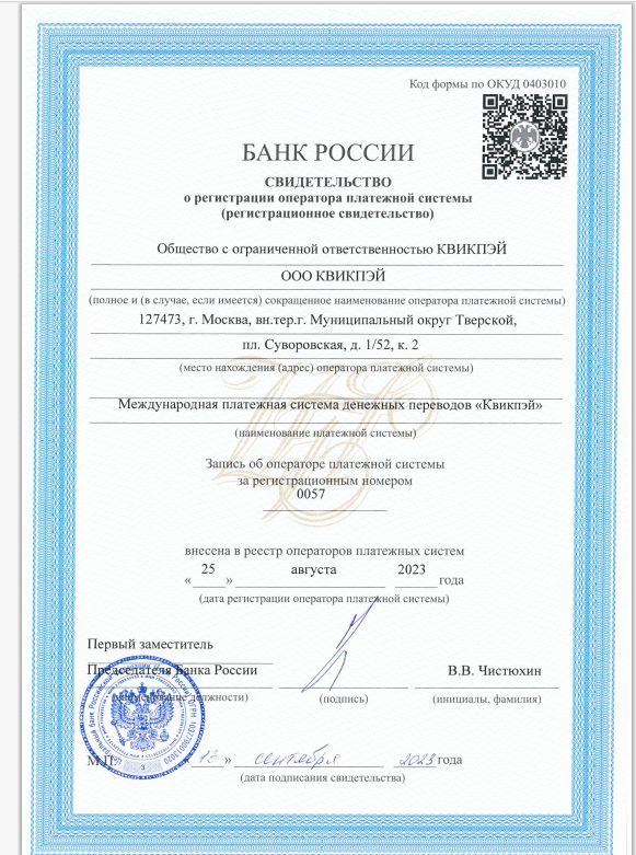 Приложений «Квикпей» функционирует полностью легально. Оно является оператором платежной системы и имеет свидетельство ЦБ РФ в качестве подтверждения.