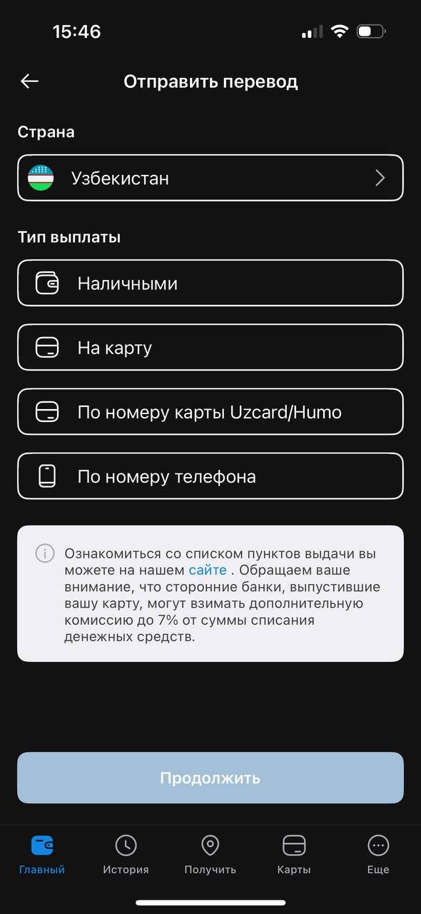 Чтобы отправить деньги человеку из другой страны, выберете соответствующую функцию в главном меню приложения.