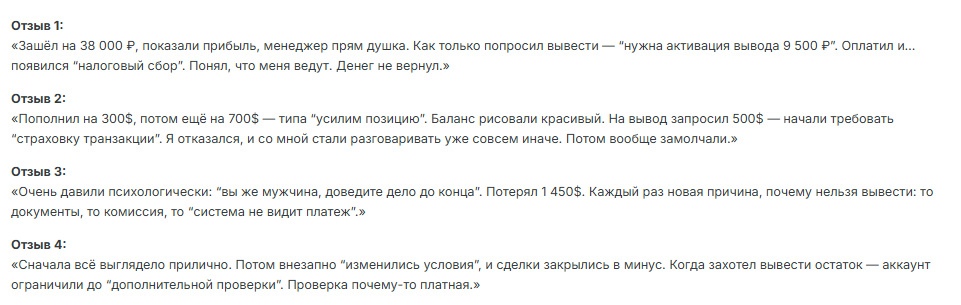 Отклики клиентов противоречивы, но доминирует негативный опыт. Многие криптаны пишут, что сначала видели рост баланса, а при попытке вывести средства столкнулись с блокировками, требованием доплат и долгим игнорированием со стороны поддержки.