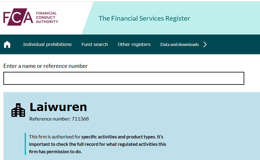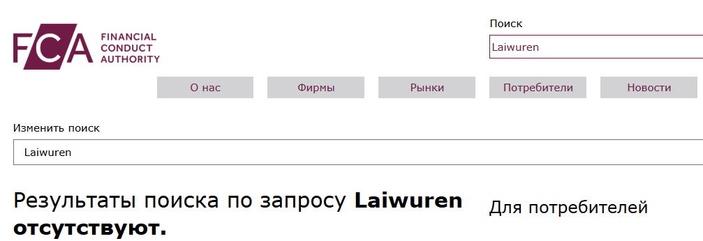 Выше скриншот по ссылке с официального сайта этого брокера. Он показывает запись на фальшивом реестре fsa regulation uk net. Настоящий же сайт британского регулятора находится по адресу fca org uk, скриншот ниже. В нем Laiwuren отсутствует.