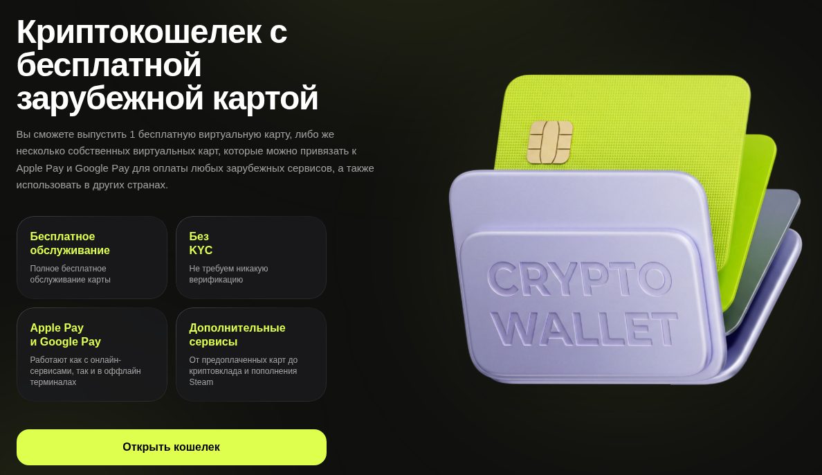 Схема работает так — пользователь регистрируется, пополняет кошелек криптовалютой, а сервис конвертирует ее в нужную фиатную валюту в момент оплаты покупки. Карта привязывается к Apple Pay и Google Pay, что позволяет расплачиваться как онлайн, так и в офлайн-терминалах за рубежом. Поддержке можно написать черно бота в Телеграме.